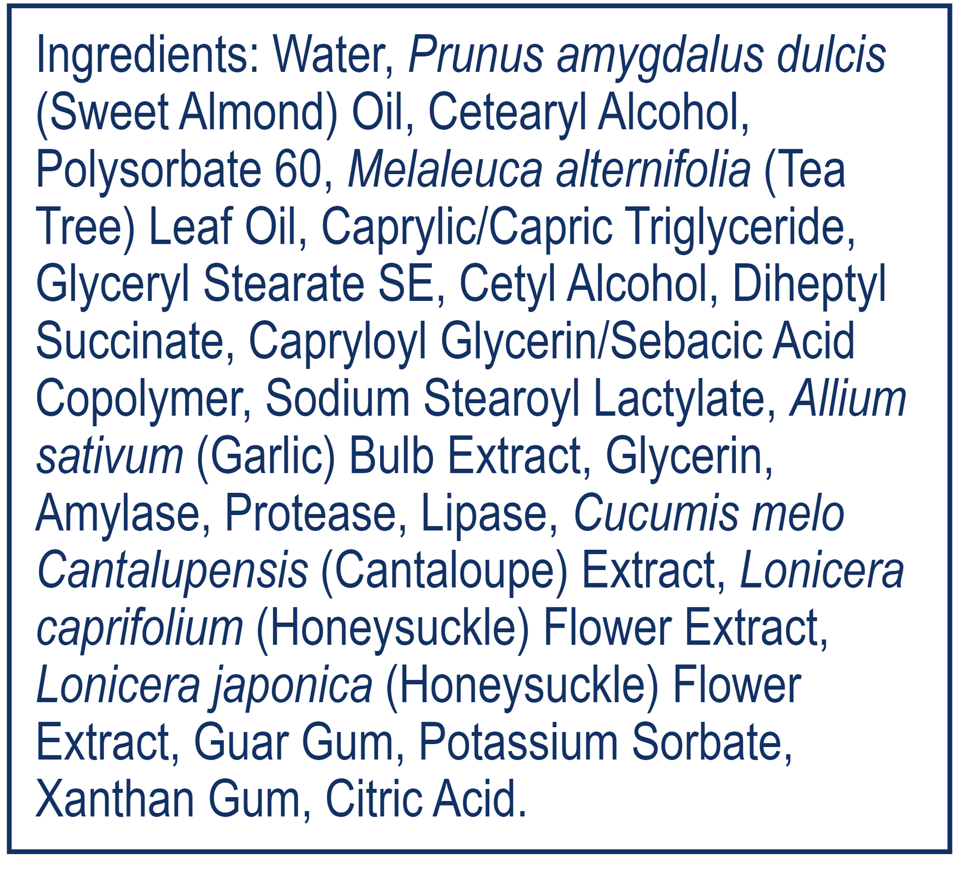 Ingredients: Water, Prunus amygdalus dulcis (Sweet Almond) Oil, Cetearyl Alcohol, Polysorbate 60, Melaleuca alternifolia (Tea Tree) Leaf Oil, Caprylic/Capric Triglyceride, Glyceryl Stearate SE, Cetyl Alcohol, Diheptyl Succinate, Capryloyl Glycerin/Sebacic Acid Copolymer, Sodium Stearoyl Lactylate, Allium sativum (Garlic) Bulb Extract, Glycerin, Amylase, Protease, Lipase, Cucumis melo Cantalupensis (Cantaloupe) Extract, Lonicera caprifolium (Honeysuckle) Flower Extract, Lonicera japonica (Honeysuckle) Flower Extract, Guar Gum, Potassium Sorbate, Xanthan Gum, Citric Acid.