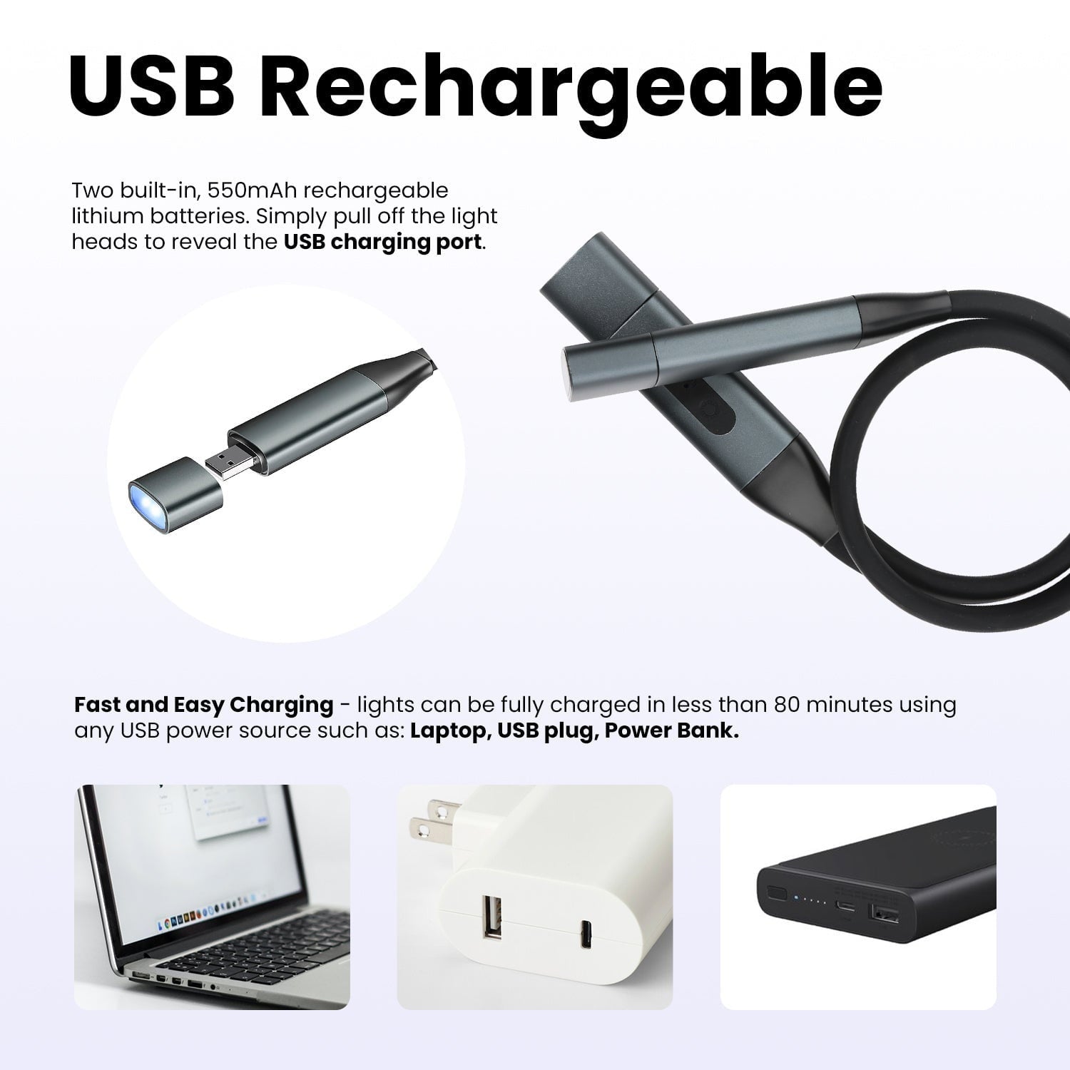 - 💡LONG LASTING & RECHARGEABLE: With our rechargeable neck light, there is no need for charging cables. Simply remove the detachable head and insert it into a computer, powerbank, or any USB socket to recharge. The light will charge from empty to full in 80 minutes. Provides up to 100 hours of use depending on brightness and color choice.