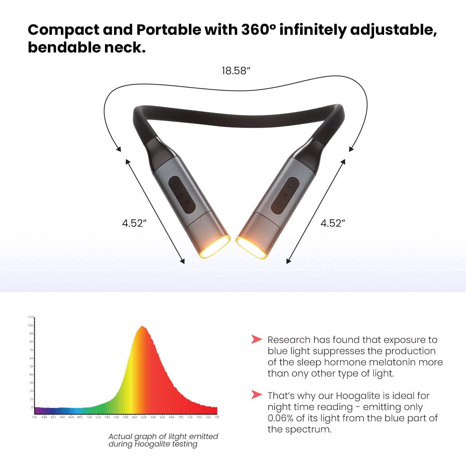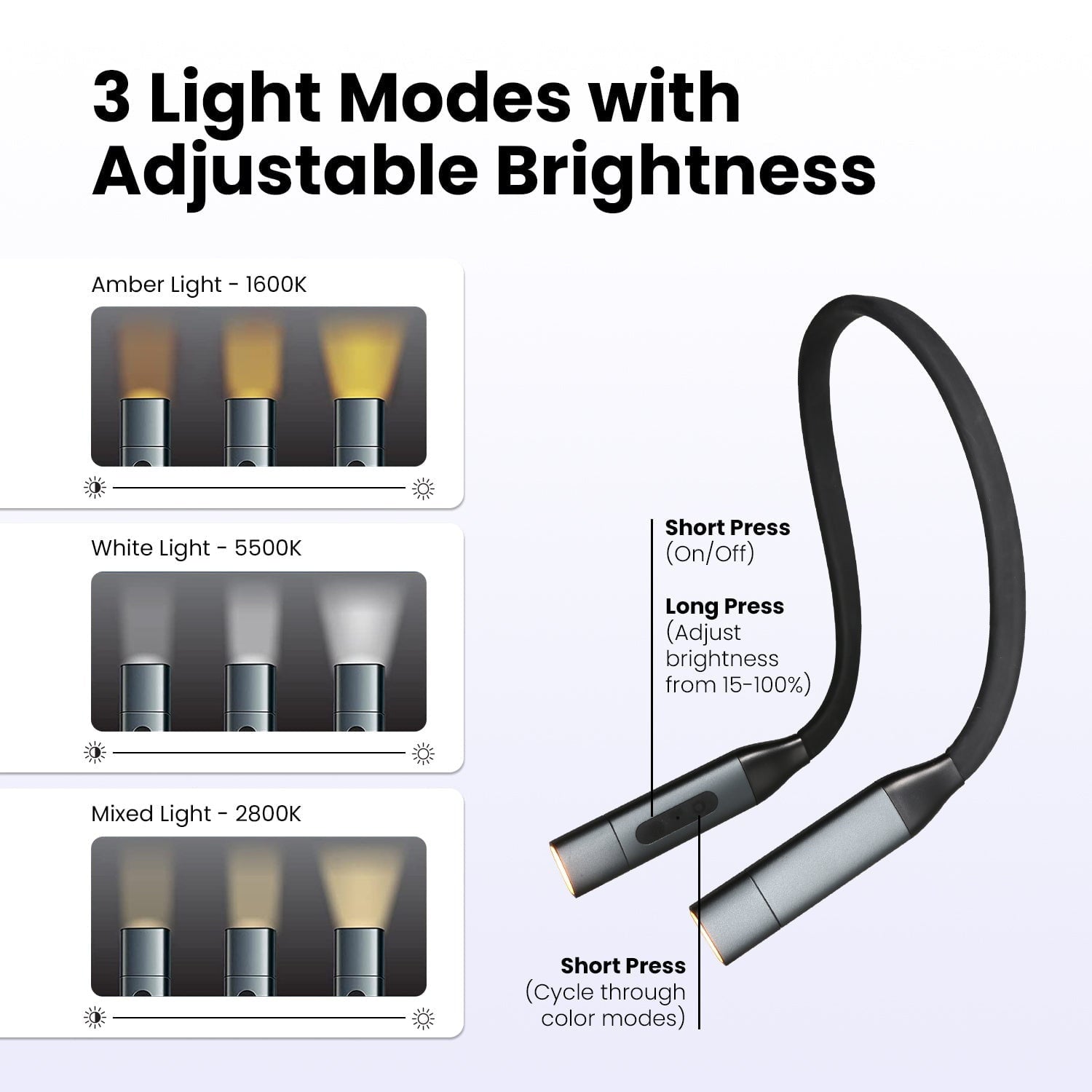 - 💡ADJUSTABLE BRIGHTNESS & 3 COLORS: The Hooga neck light features three different color modes: amber (1600K), natural, warm white(2800K) and cool white (5500K) and adjustable brightness. Press and hold for stepless brightness from 15% to 100%. Amber light lacks blue light for optimal sleep, while warm white is nice for afternoon and evening. Cool white is best for during the day.
