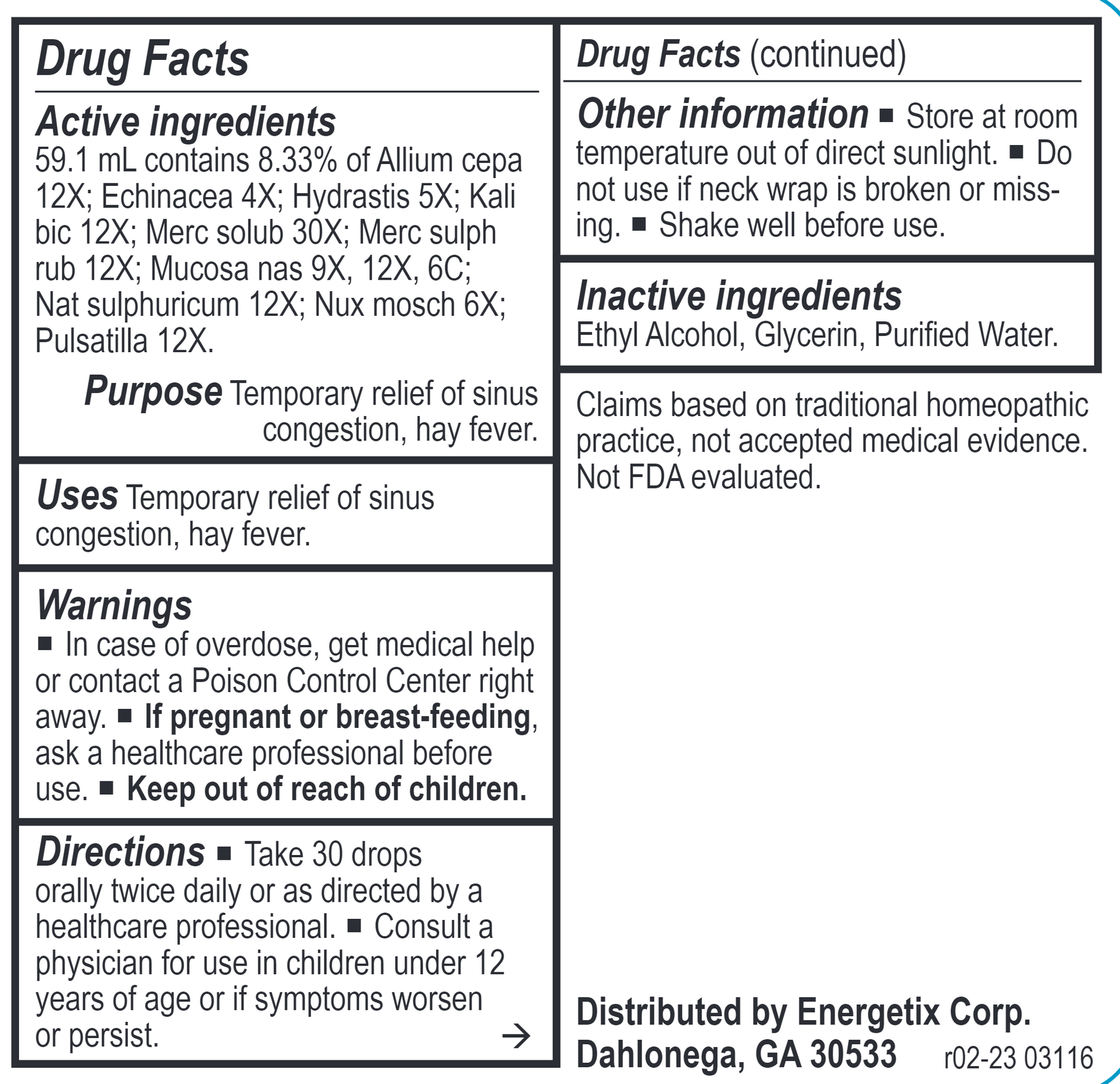 Active Ingredients:59.1 mL contains 8.33% of Allium cepa 12X; Echinacea 4X; Hydrastis Canadensis 4X; Kali bichromicum 12X; Mercurius solubilis 30X; Mercurius sulphuratus ruber 12X; Mucosa nasalis suis 9X, 12X, 6C; Natrum sulphuricum 12X; Nux moschata 6X; Pulsatilla 12X.
